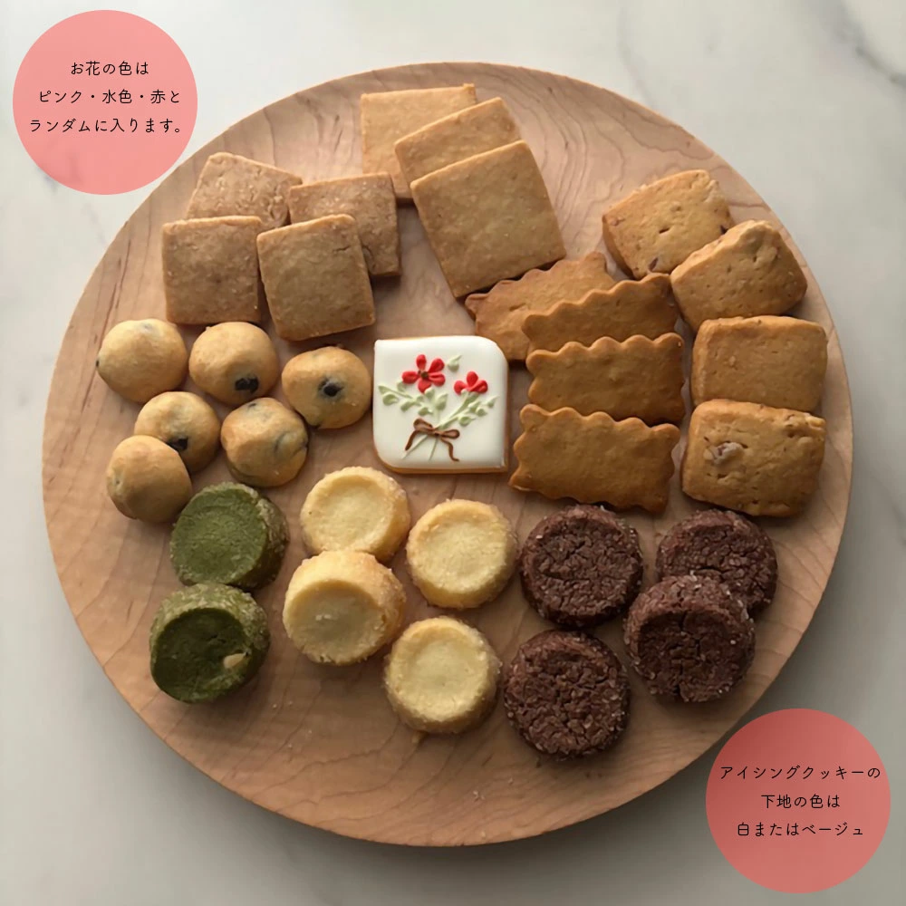 ※アイシングクッキーの下地の色は白またはベージュ、お花の色はピンク・水色・赤とランダムに入ります。